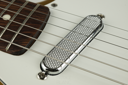 Micros boutique Patrice Blanc, aimants USA, finition Single Foil, Flat six. Mécaniques: Kluson à Bain d'huile Chevalet: Hard tail cordes traversantes, 6 pontets individuels Tout accastillage par Gotoh Potentiomètres Alpha Selecteur 4 positions Serie/ Neck/ Parallèle/ Bridge 2400 Euros , Etui en supplément